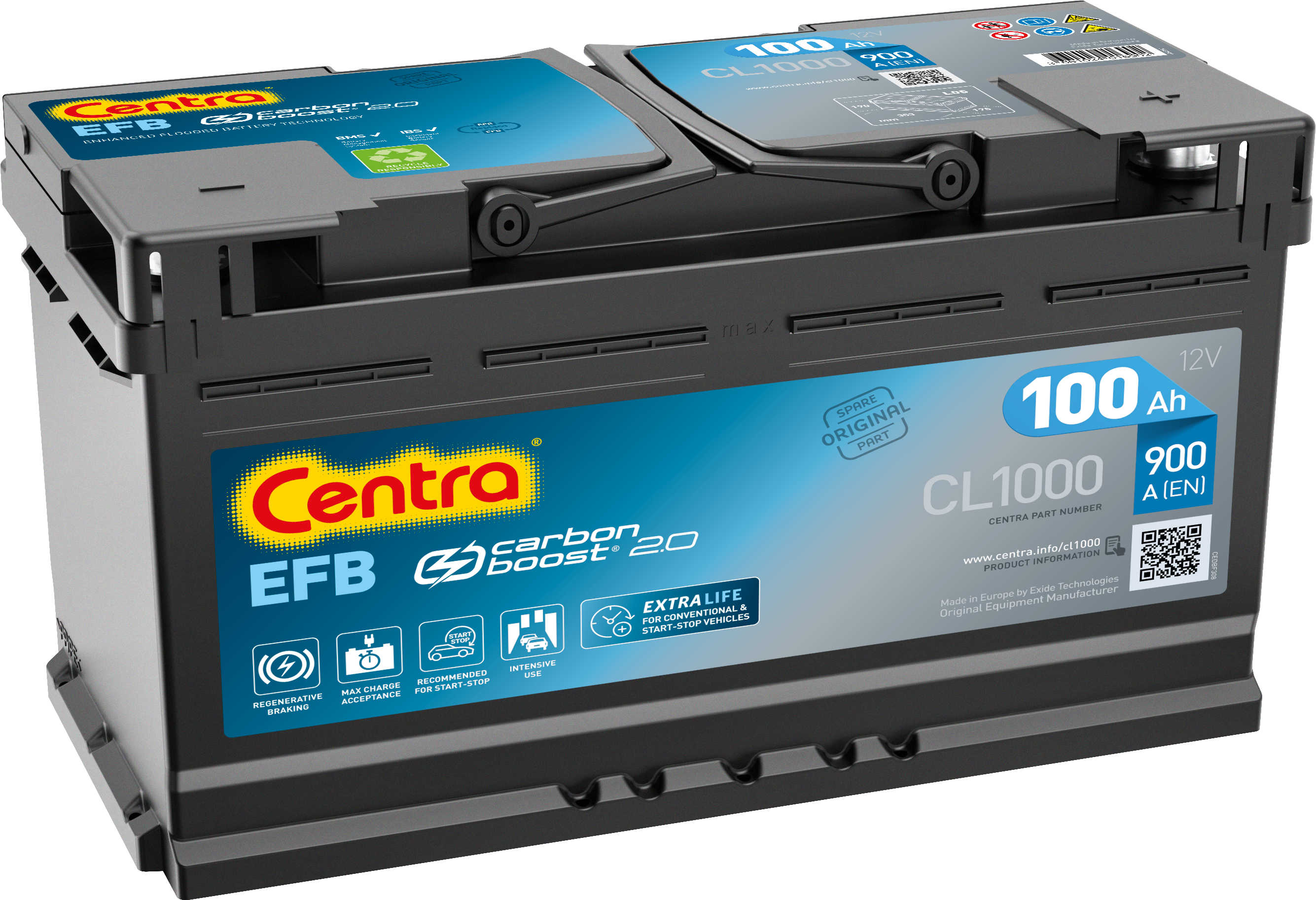 Akumulator CENTRA EFB CL1000 12V 100Ah 900A należy do nowoczesnej serii Centra EFB (Enhanced Flooded Battery) — akumulatorów zaprojektowanych z myślą o współczesnych pojazdach z systemem Start-Stop, odzyskiwaniem energii hamowania oraz instalacjami o zwiększonym zapotrzebowaniu energetycznym.