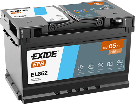 Akumulator EXIDE EFB EL652 12V 65Ah 650A należy do linii Exide EFB (Enhanced Flooded Battery) — technologii, która łączy zalety klasycznych akumulatorów kwasowo-ołowiowych z zwiększoną odpornością na częste cykle pracy i rozładowania.