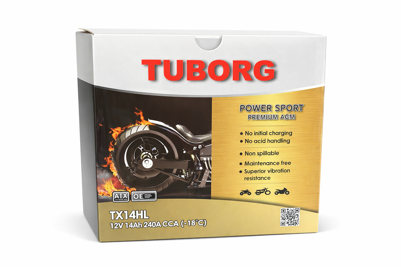Tuborg TX14HL YTX14L 12V 14Ah 240A to wzmocniony akumulator motocyklowy w technologii AGM, przeznaczony do pojazdów wymagających wysokiej wydajności oraz niezawodnego rozruchu.