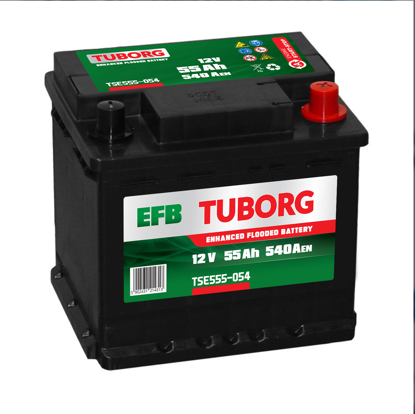 Akumulator Tuborg EFB 12V 55Ah 540A TSE555-054 zastosowano technologię EFB (Enhanced Flooded Battery) — ulepszoną wersję klasycznych akumulatorów kwasowo-ołowiowych, która zapewnia lepsze parametry cykliczne i większą trwałość niż standardowe akumulatory.